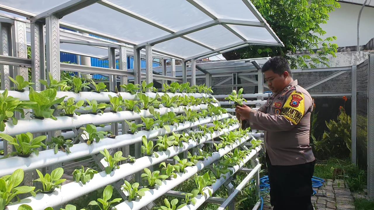 Dalam kegiatan tersebut, Briptu Yayang Aji melakukan pengecekan langsung terhadap perkembangan budidaya sayuran yang terdiri dari sawi, pak choy, dan kangkung sebagai bagian dari program ketahanan pangan yang tengah dijalankan oleh masyarakat setempat.