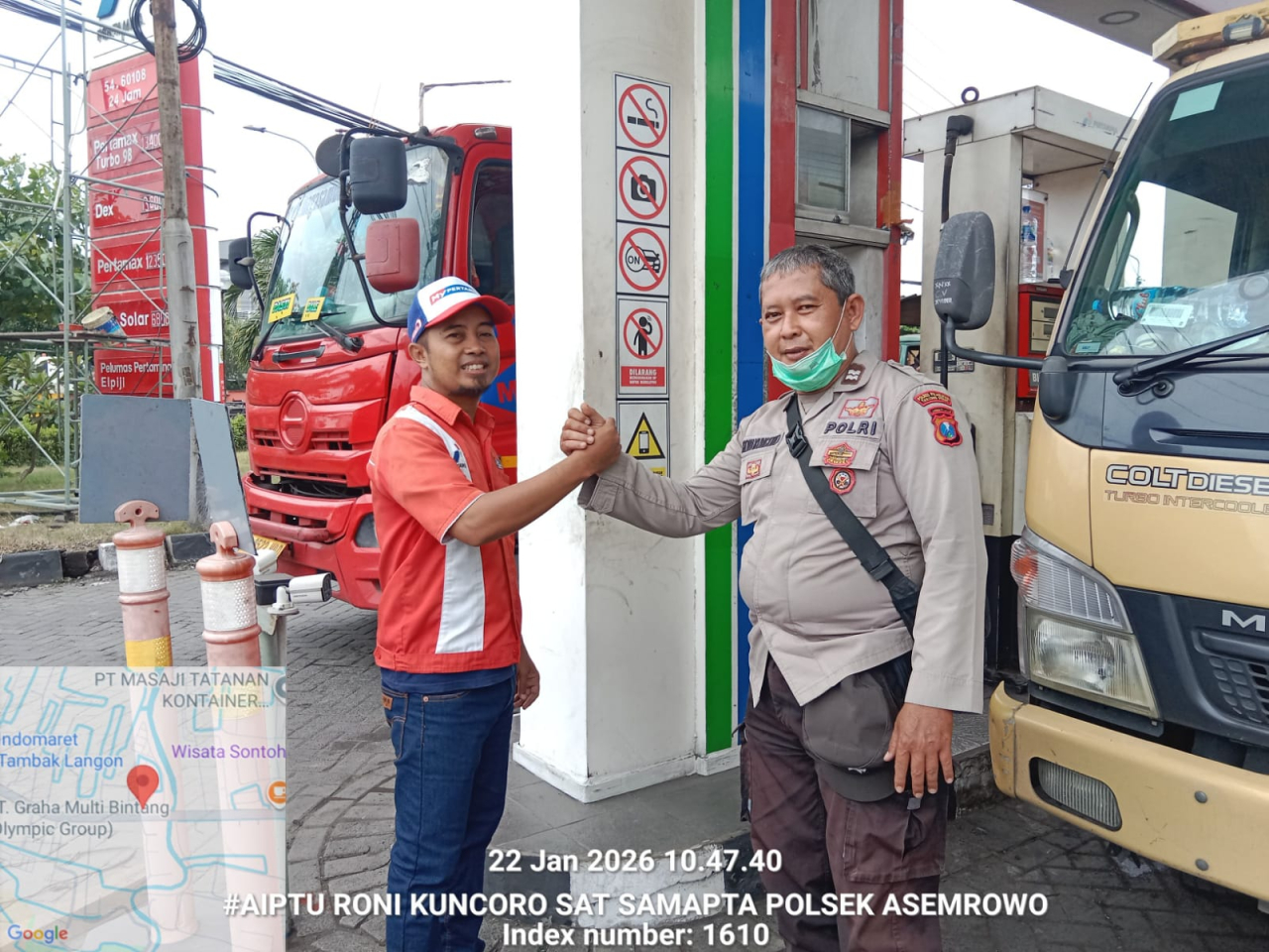 Seputarperak.com – Kamis, 22 Januari 2026 Personel Polsek Asemrowo melaksanakan kegiatan patroli dialogis di SPBU Tambak Langon Nomor 2–4 sebagai bagian dari upaya preventif dalam menjaga keamanan dan ketertiban masyarakat di wilayah hukumnya. Kegiatan ini dilakukan dengan menyasar lokasi-lokasi vital dan objek pelayanan publik yang memiliki aktivitas masyarakat cukup tinggi, salah satunya stasiun pengisian bahan bakar umum.