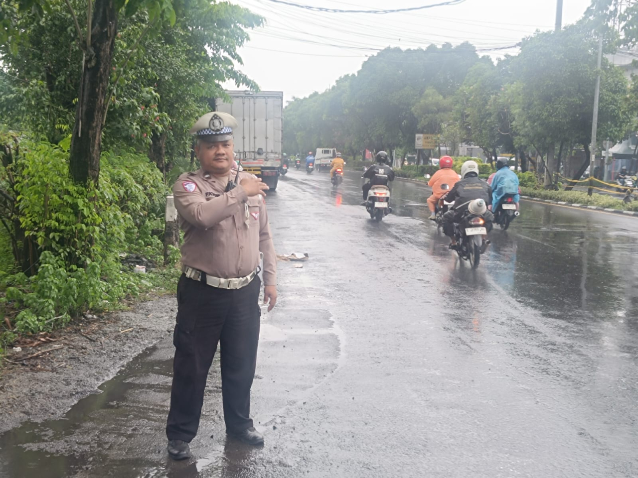 Dalam pelaksanaan kegiatan, petugas melakukan pengawasan secara langsung terhadap arus kendaraan guna mengantisipasi potensi kemacetan maupun gangguan lalu lintas lainnya yang dapat terjadi akibat kondisi jalan yang basah dan licin.