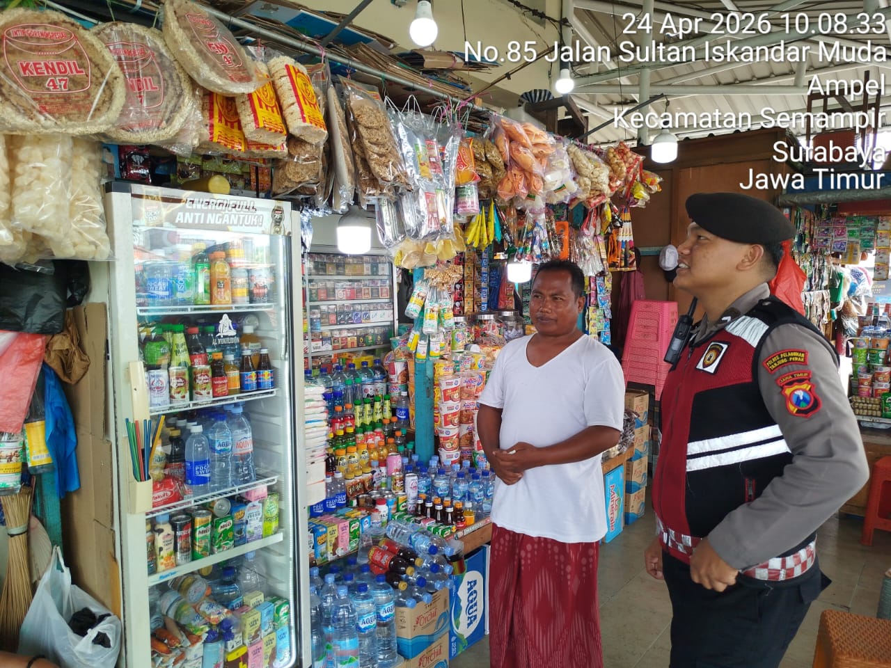 Personel Satsamapta memberikan himbauan kamtibmas kepada pemilik usaha agar tetap meningkatkan kewaspadaan terhadap potensi gangguan keamanan, termasuk tindak kriminalitas yang dapat mengganggu aktivitas perdagangan maupun kenyamanan masyarakat.